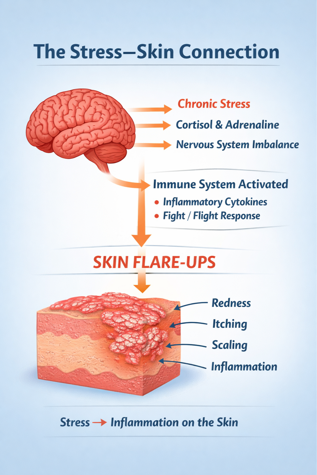 Diagram showing how stress in the brain and nervous system triggers immune inflammation and psoriasis skin flare-ups.