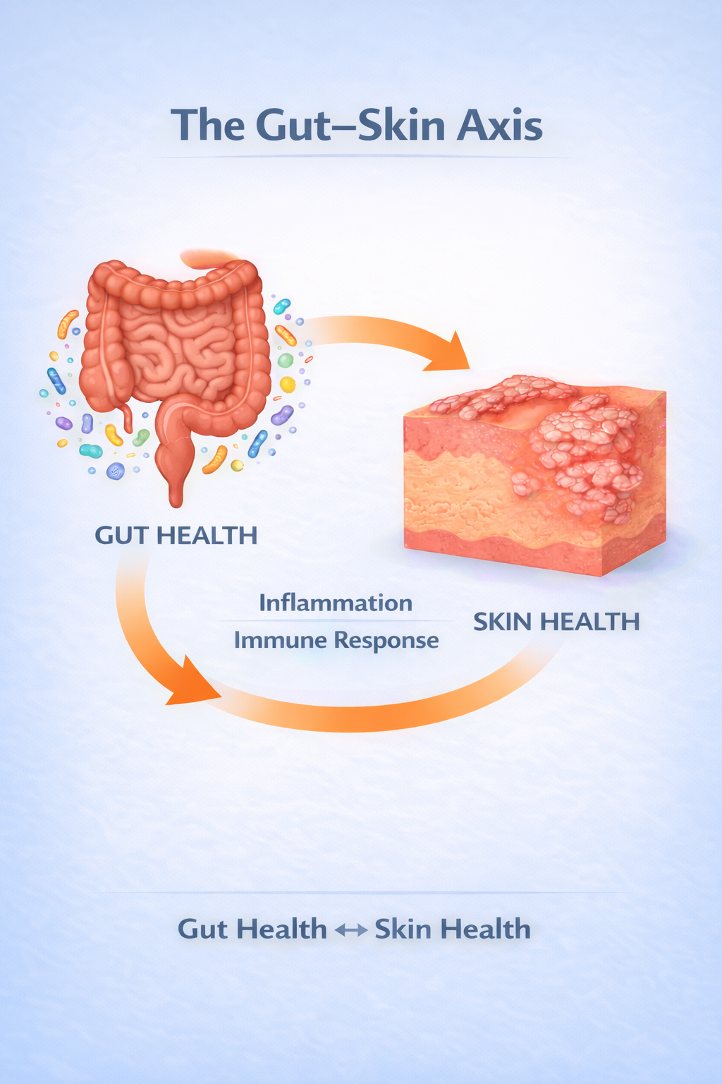 The gut and skin communicate through the immune system. When gut health is disrupted, inflammation can appear on the skin.