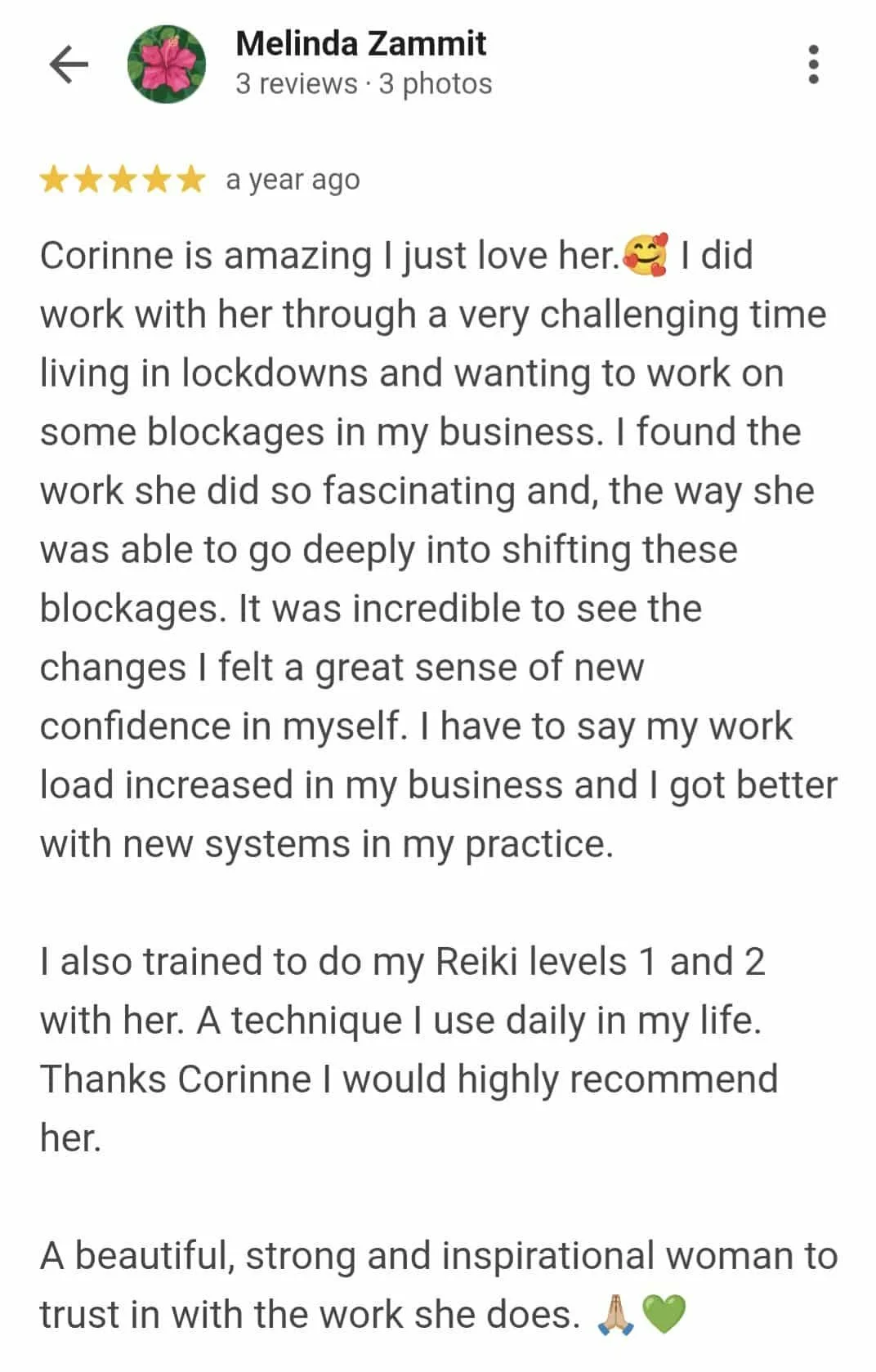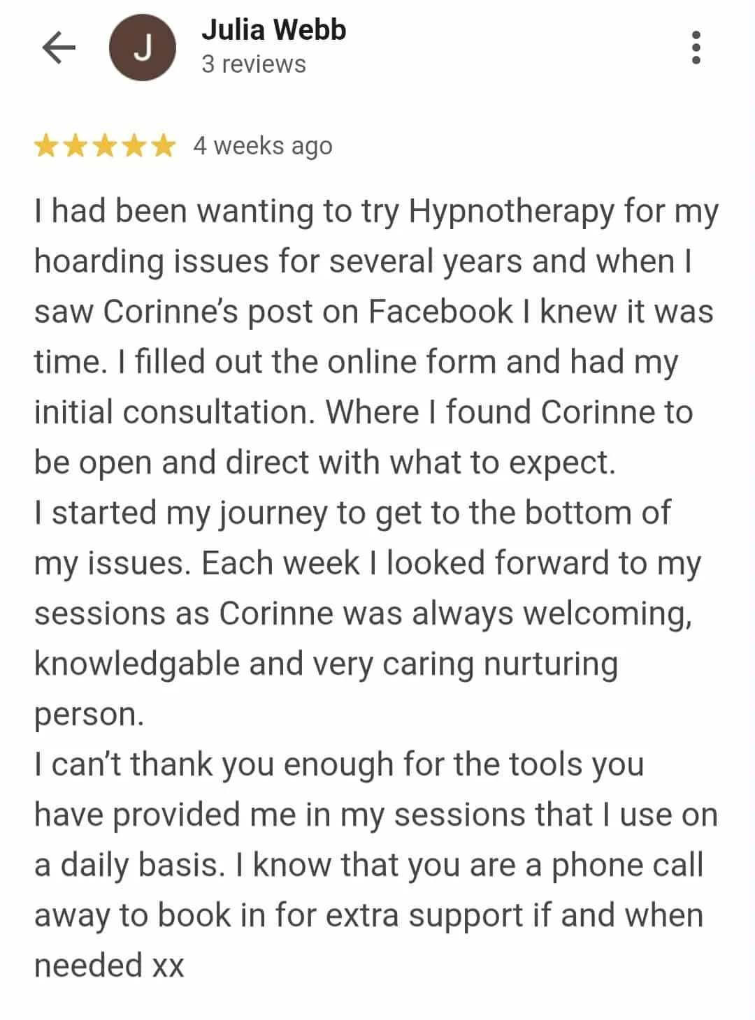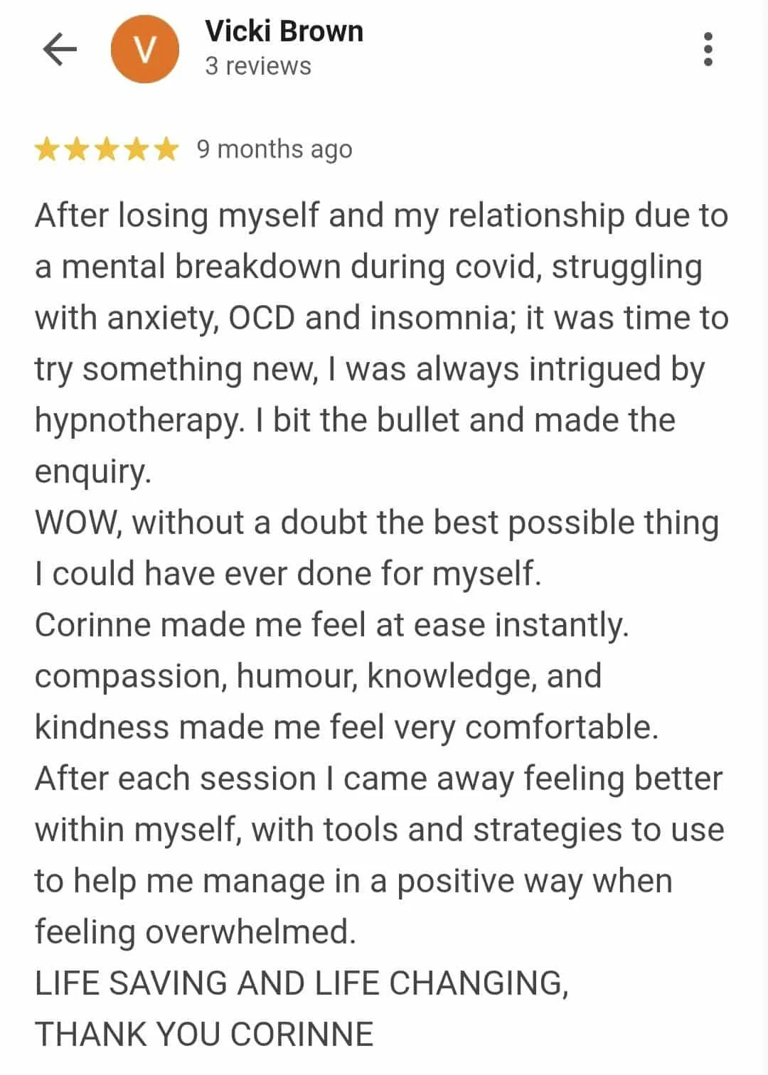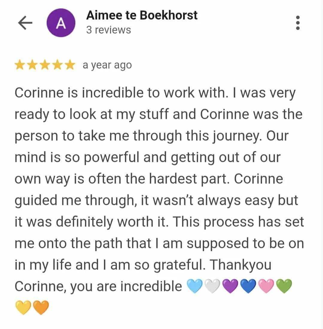 “There’s been a lot of sexual trauma in my past, a bit of bullying, a lot of trauma’s growing up. I definitely love Corinne’s program and the Time Line Therapy we did because it kind of got me back into a situation where if I get scared or hurt, in the future I can still feel those emotions but I don’t hang onto them and they’re nowhere near as intense. I’m more aware and just look at the light in every situation. There’s always a light in every situation, always a learning and a gift and you always learn something positive even if it’s a really negative experience you always learn something positive from it. I was quite nervous because I felt like I’d feel those old emotions forever, but I went into it with an open mind and after the first session I was mind blown because it just felt like a complete weight had been lifted. I felt so different. It was so good to finally get that weight lifted and it’s still great now because you never forget your learnings and you never forget the gifts that those emotions and those experiences have given you, so it’s been wonderful to go through the journey with Corinne and release it all.”