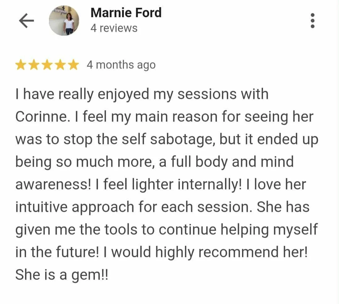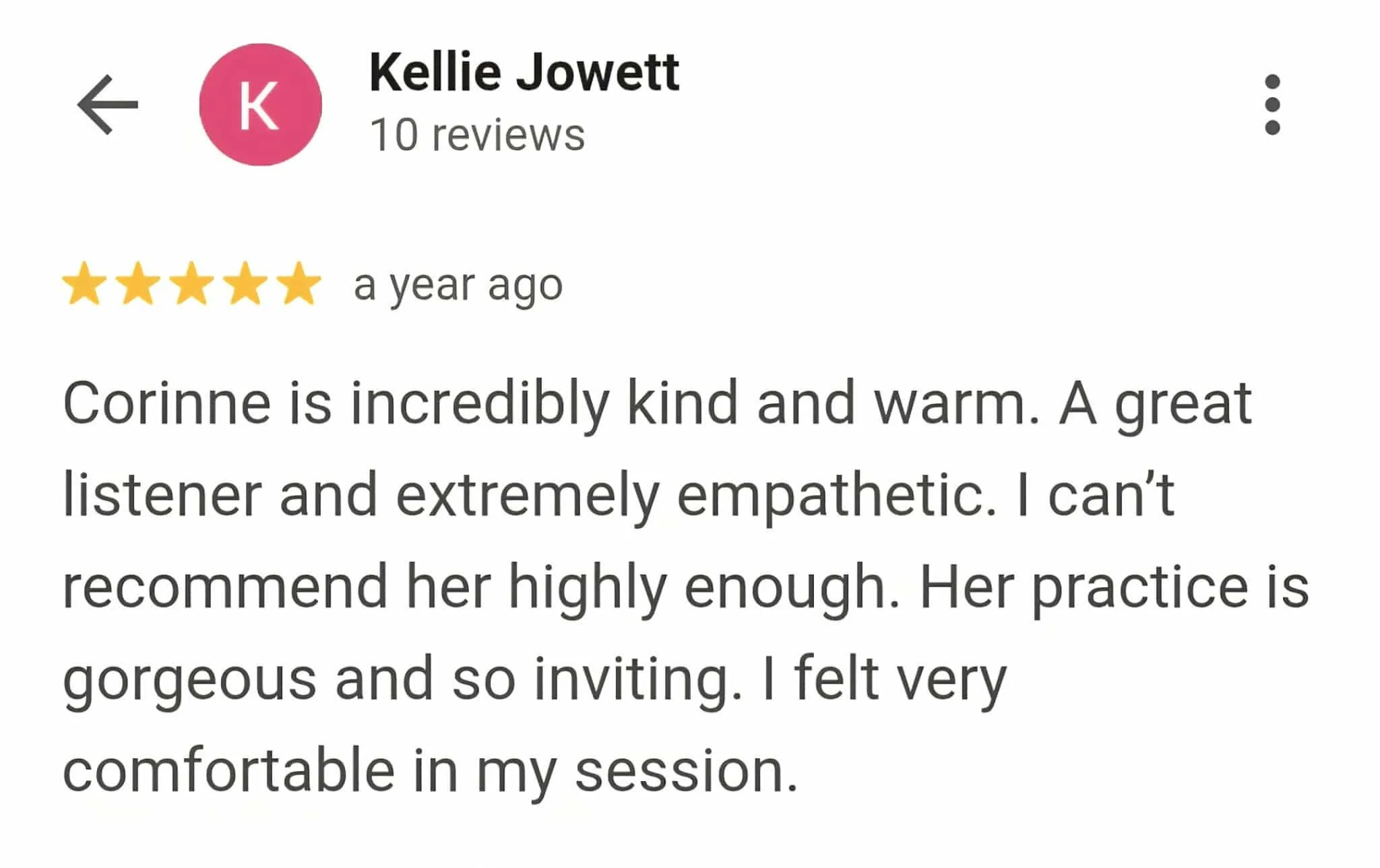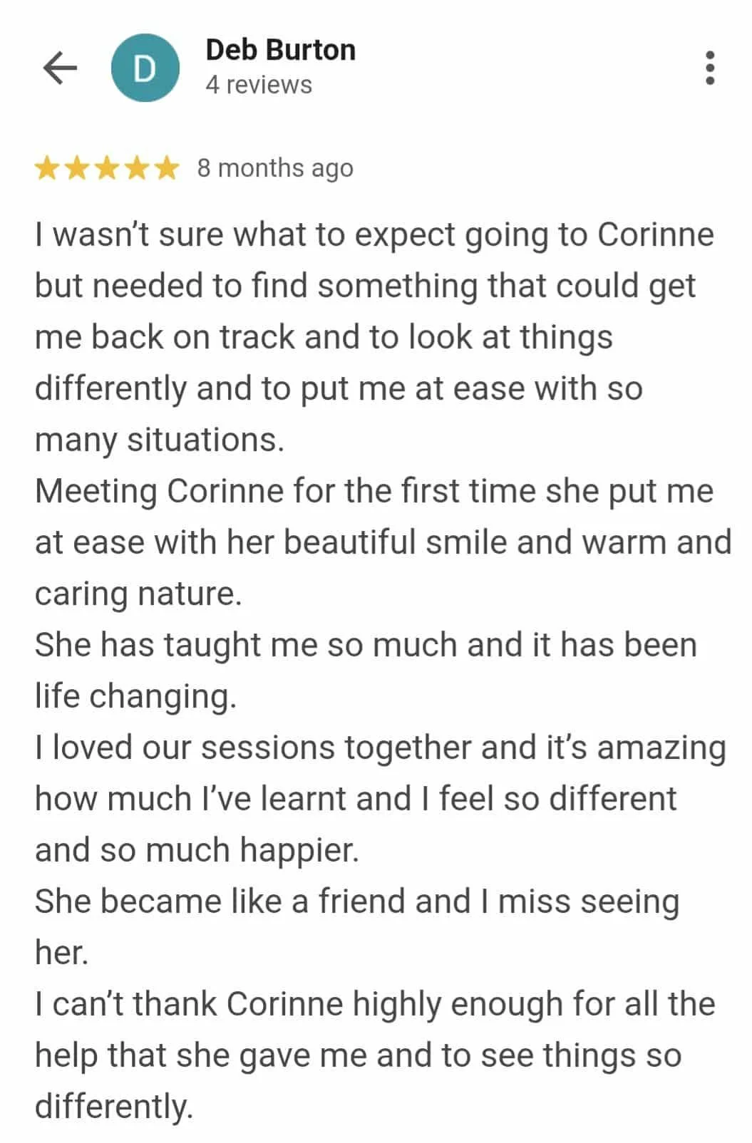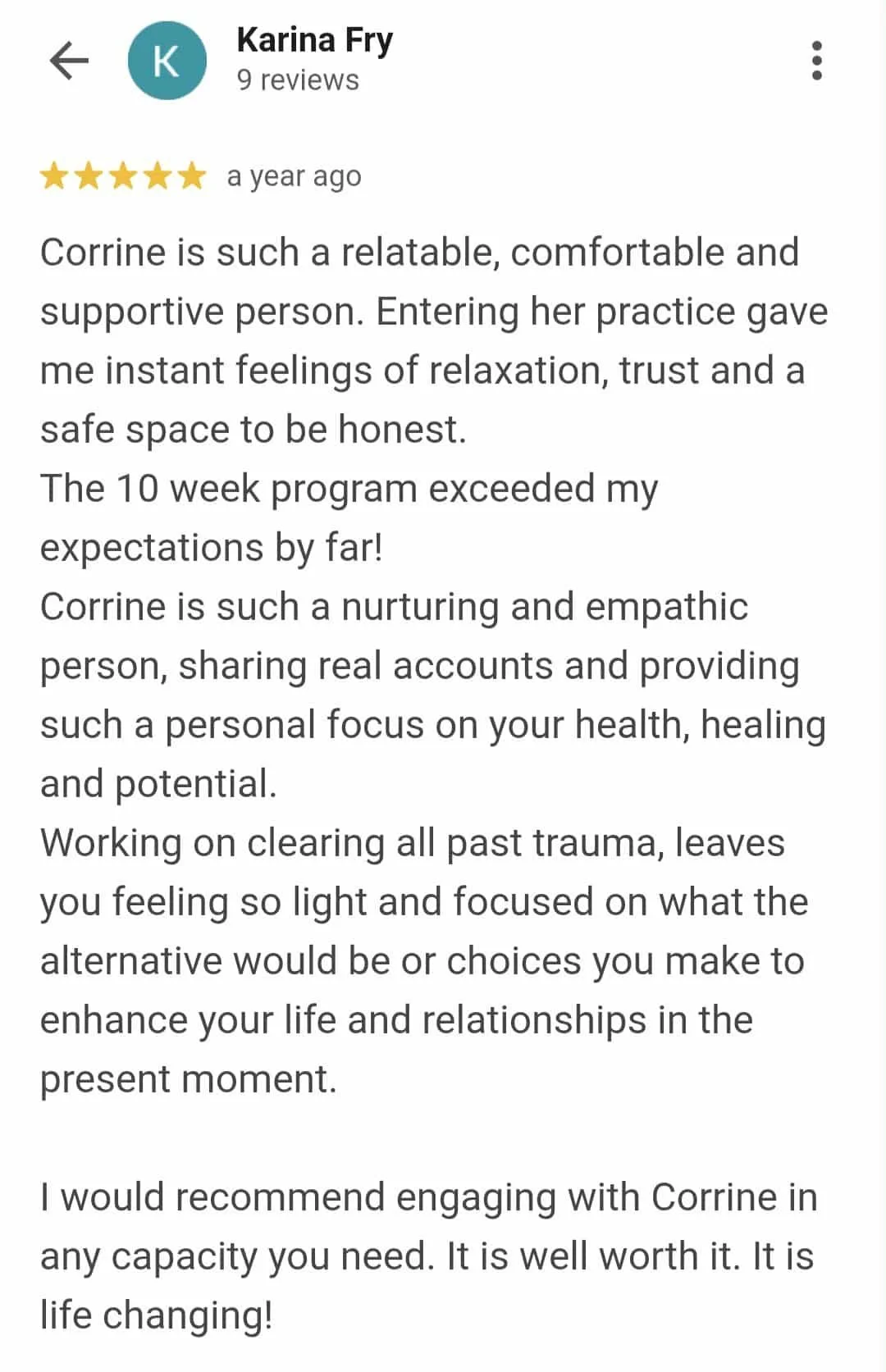 "Corinne has so much joy, compassion & understanding. Without her, my journey would not have made me the person I am today & strive to continue to be in the future. Thank you from the bottom of my heart.”