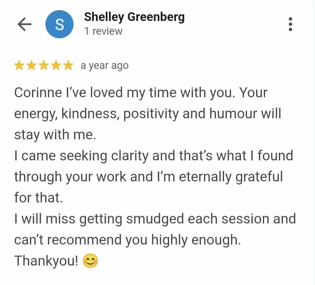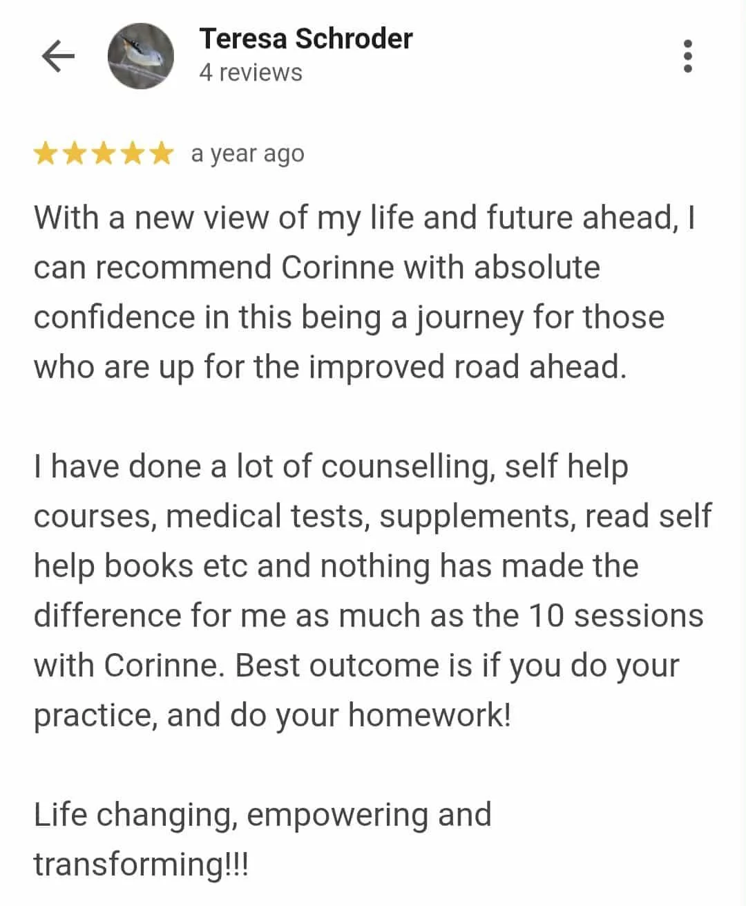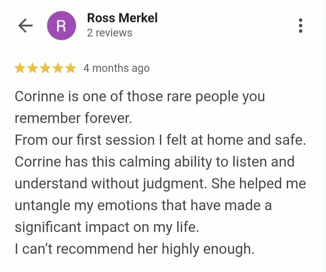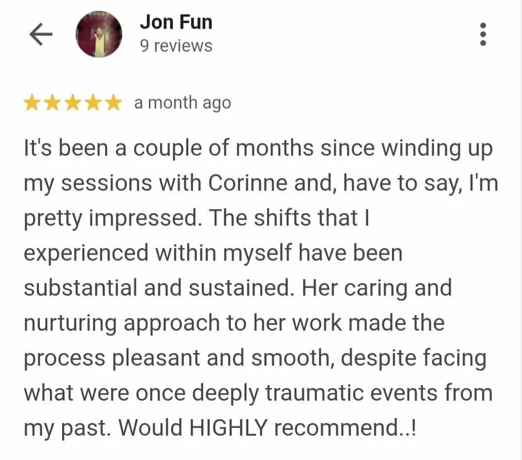 "Corinne has so much joy, compassion & understanding. Without her, my journey would not have made me the person I am today & strive to continue to be in the future. Thank you from the bottom of my heart.”